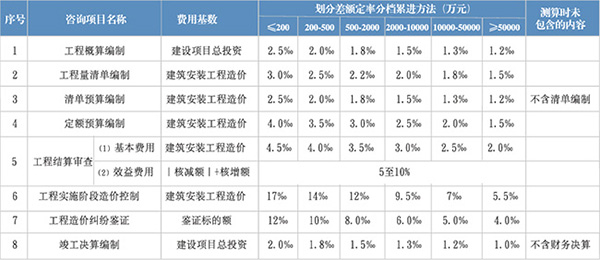 8、工程概算、工程量清單、清單預算、定額預算、竣工決算的審核費用,按照本表所對應的咨詢項目編制費率的90%計取費用;